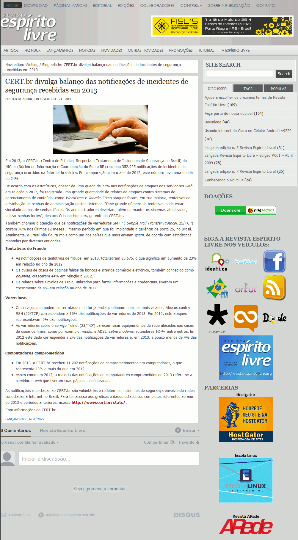 CERT.br divulga balanço das notificações de incidentes de segurança recebidas em 2013