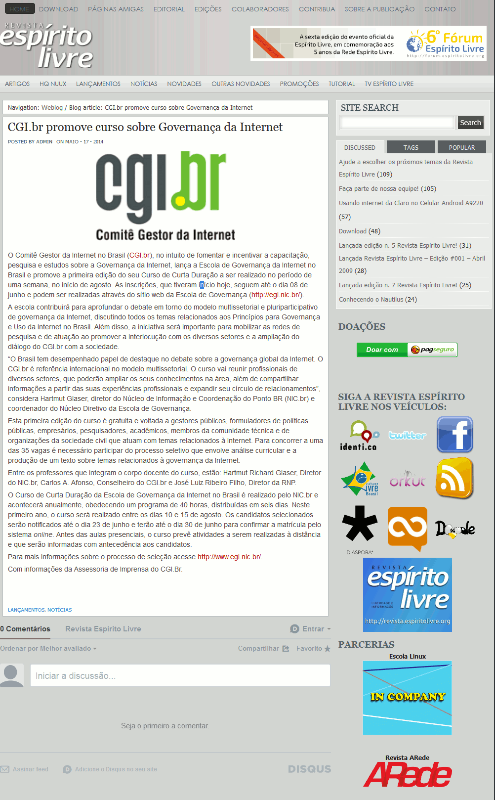 Para mais informações sobre o processo de seleção acesse http://www.egi.nic.br/.