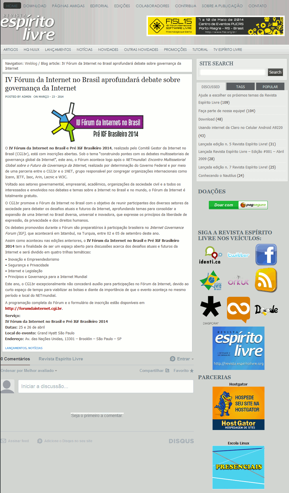 O IV Fórum da Internet no Brasil e Pré IGF Brasileiro 2014, realizado pelo Comitê Gestor da Internet no Brasil (CGI.br), está com inscrições abertas. Sob o tema “construindo pontes com os debates multissetoriais de governança global da Internet”, este ano, o Fórum acontece logo após o NETmundial: Encontro Multissetorial Global sobre o Futuro da Governança da Internet, realizado por determinação do Governo Federal e por meio de uma parceria entre o CGI.br e o 1NET, grupo responsável por congregar organizações internacionais como Icann, IETF, Isoc, Arin, Lacnic e W3C.